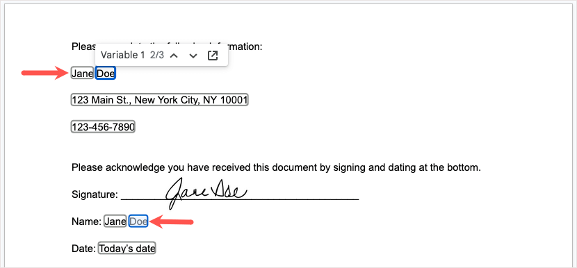 When we share the document, the recipient simply selects each Variable and enters their information. The Variables that are used more than once update automatically.