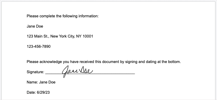 In this next example, we have a document we want someone else to complete with their details. We set up Variables for first name, last name, address, phone number, and date.