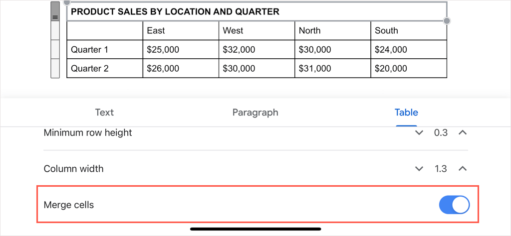 - Tap the Format button (underlined A) at the top, select the Table tab in the pop-up menu, and turn on the toggle for Merge cells.