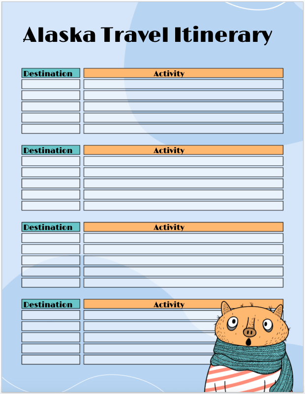 Planning a cold weather vacation like skiing or snowboarding? This Alaska Travel Itinerary template is a cute option with its colorful appearance and warmly dressed character. Include the destinations and activities for each day of your trip to a cold-weather state, country, or region.