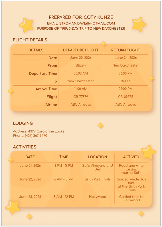 If you’re heading someplace warm on your vacation instead, this yellow and orange Sunny Itinerary template is just what you need. Enter your flight details for your departure and return, information for accommodations, and then activities for each day with times and locations.