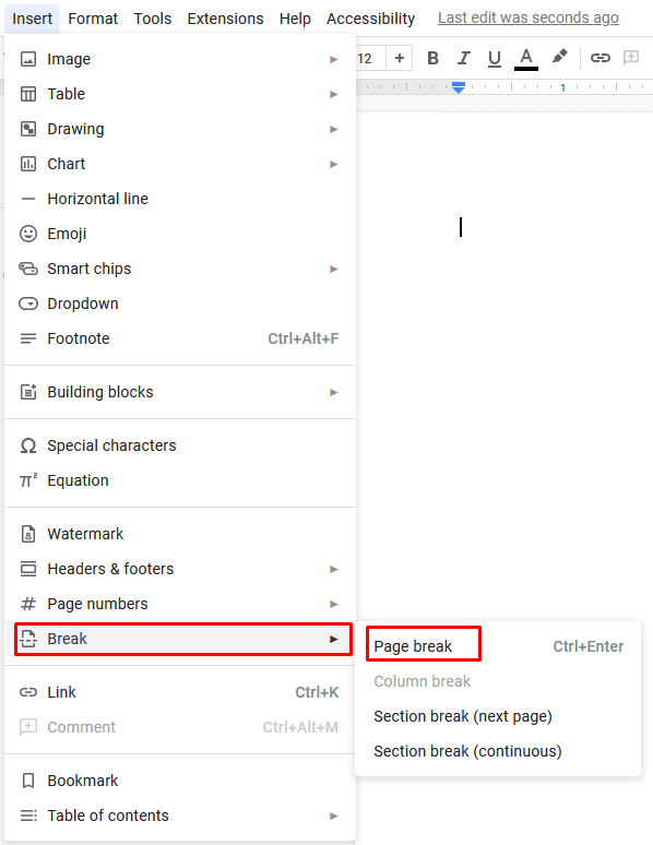 - Select Break from the drop-down menu, and then Page break from the side menu.