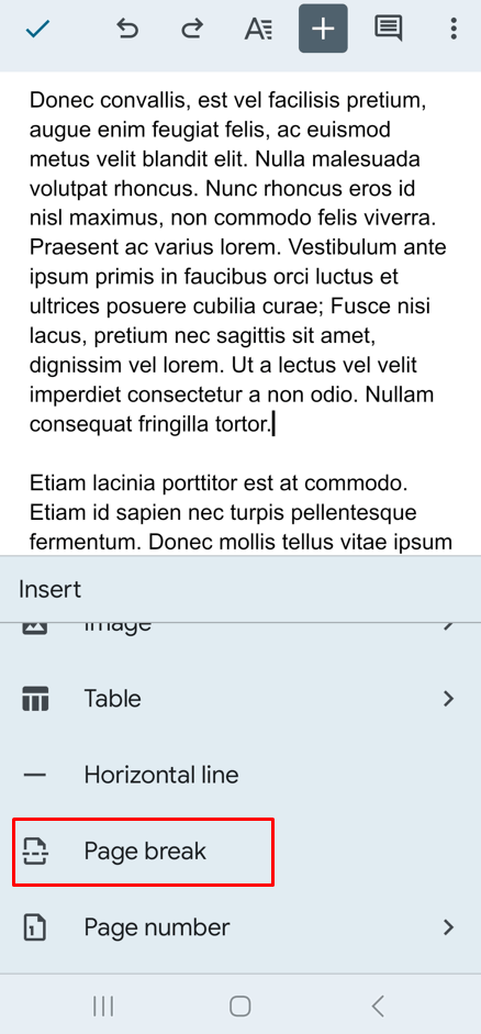 Adding a Page break in Google Docs on a mobile device is just as simple as doing it on a desktop. However, the steps are slightly different: