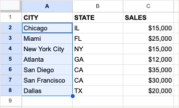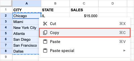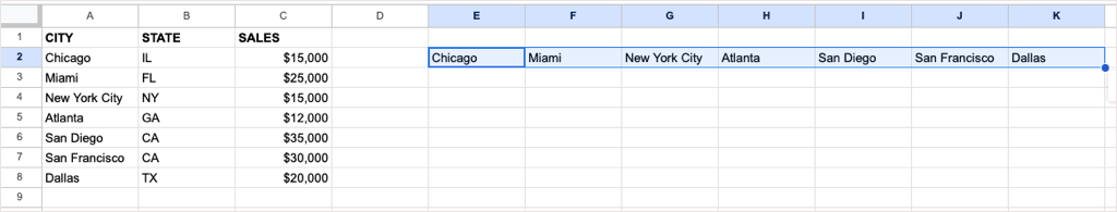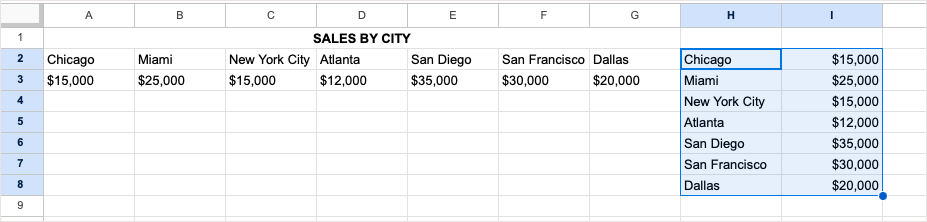 - Start by selecting the data you want to transpose. For example, we’ll convert our column of cities to a row.