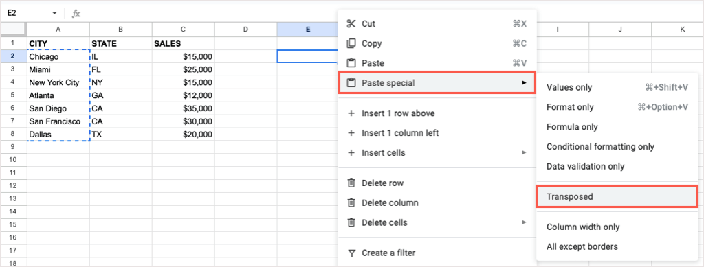 - Either select Edit > Paste Special or right-click and move to Paste Special. Then, pick Transposed in the pop-out menu.