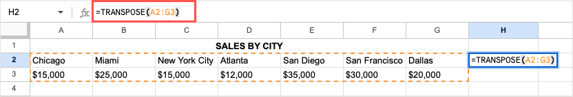 If you’re accustomed to using Google Sheets formulas, you can convert your rows or columns using the TRANSPOSE function and a simple formula.