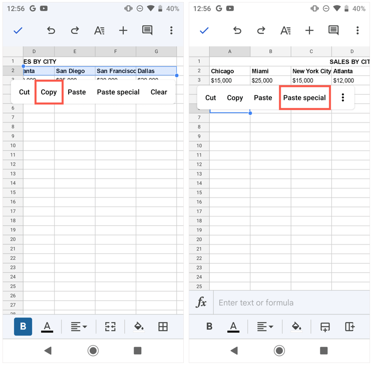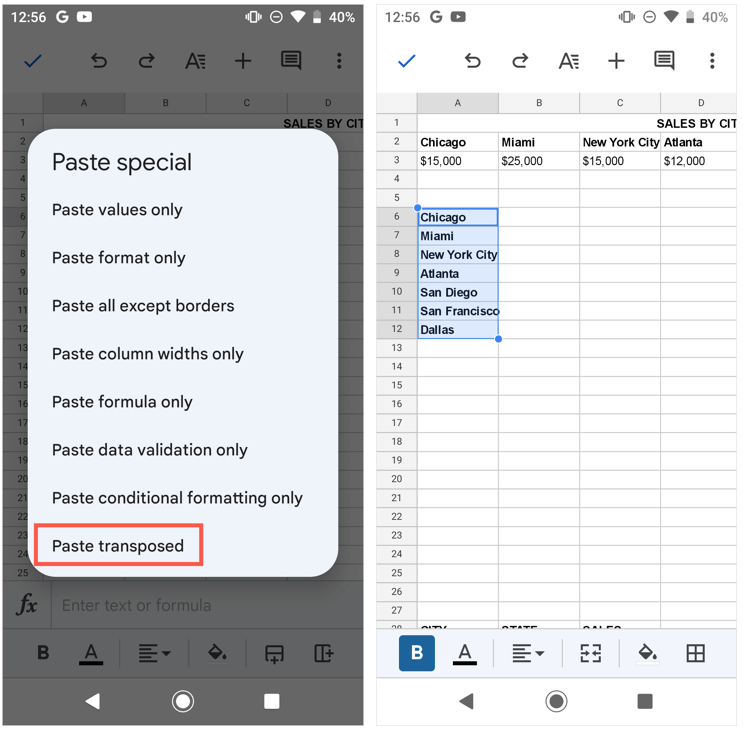 If you’re working with Google Sheets on your Android or iOS device, you can convert rows and columns there as well. While you can use the Paste Special feature or the TRANSPOSE function on Android, you can currently only use the function on iPhone.
