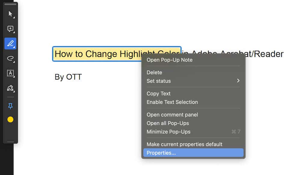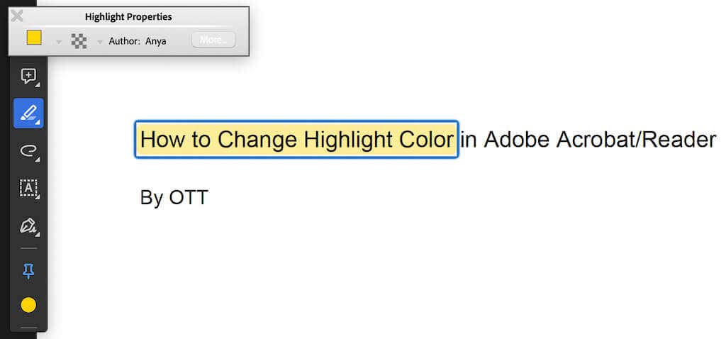 If you’re using a Mac, you can use a keyboard shortcutto change the highlight color of the text in Adobe Acrobat. Press Command (Cmd) + E to access the Highlight Properties pop-up window. There, you can change the highlight color as well as the opacity. You can also select More to open the full-sized Highlight properties window.