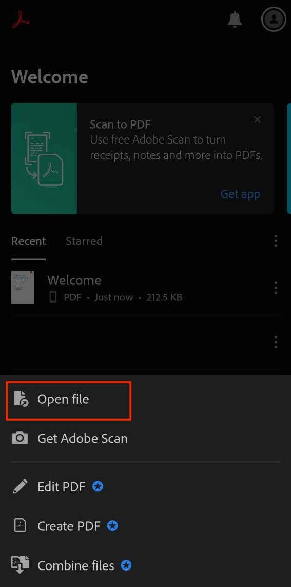 In Adobe Acrobat Reader, select Open File to add the PDF file you wish to edit to Acrobat Reader on your phone. You can import the file from your smartphone and let the app detect it automatically.