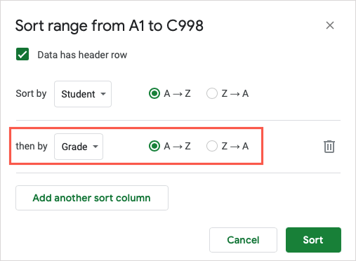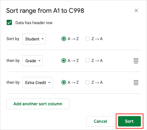 - Continue this process for all columns you want to sort by in the cell range.