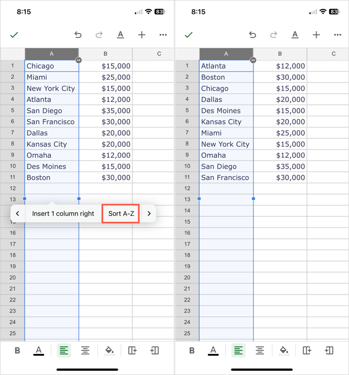 Sort Alphabetically in Google Sheets on Mobile