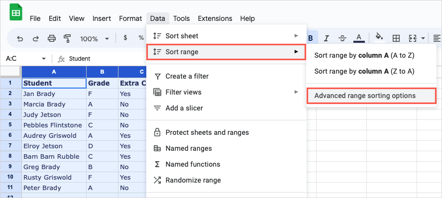 If you have a sheet where you want to sort by a column alphabetically but also sort additional columns of data, you can perform an advanced sort.