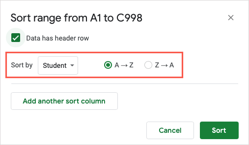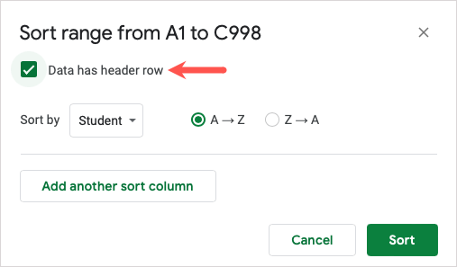 - In the pop-up window, check the box at the top for Data has header row to exclude this data from the sort if you like.
