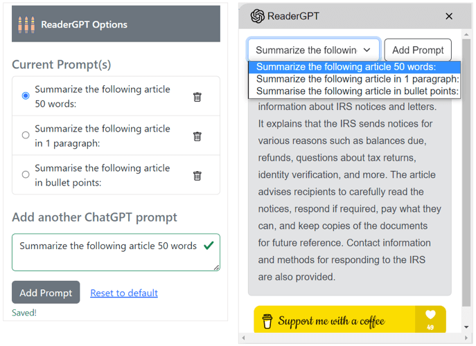 Set up multiple prompts and choose the one you want from the drop-down menu. For example, you can ask to summarize the page using bullet points, in under 50 words, or with one paragraph.