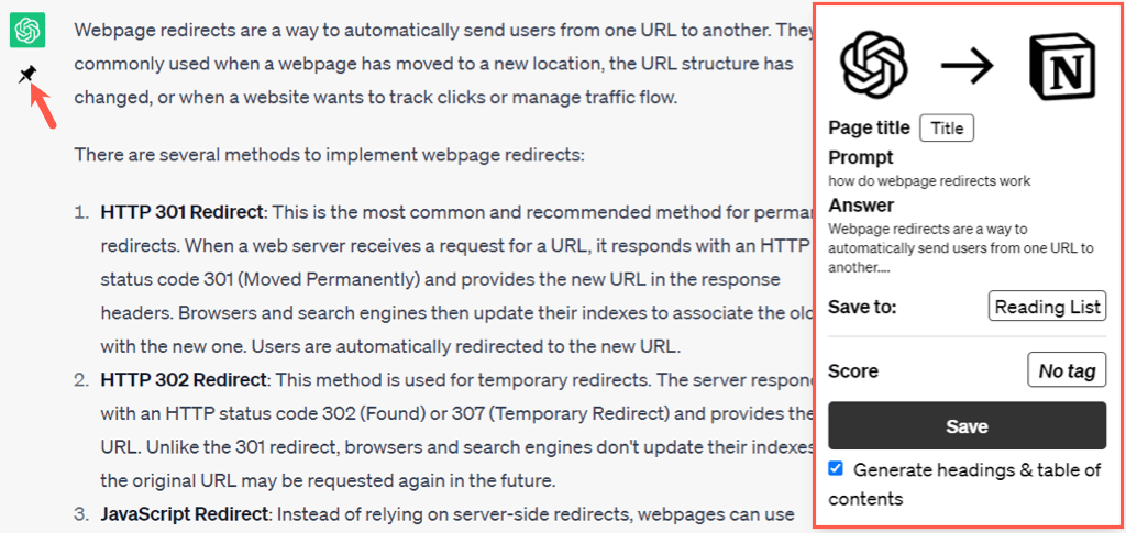 When you submit a prompt and receive the response on ChatGPT, you’ll see a pin icon beneath. Select that pin and pick the Notion database where you want to save it.