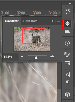 You can also use the Navigator Panel to Zoom in or out of your image or canvas in Photoshop. You’ll find the Navigator Panel on the right side of the Photoshop screen by selecting the icon that looks like a ship steering wheel.