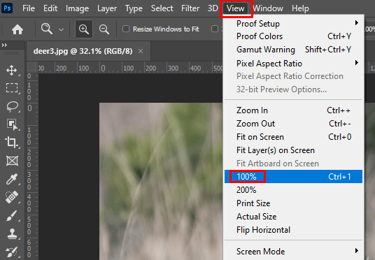 Whenever you want to get the most accurate view of an image, you should look at it at 100% zoom. That’s because, at 100%, one monitor pixel will display one image pixel. To quickly jump to 100% view you can select it from the View menu on the ribbon. Simply choose the 100% option from the drop-down menu.