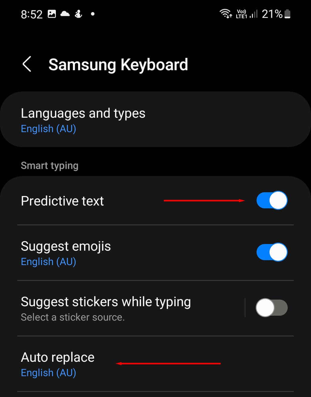- For Samsung Keyboard, toggle off Predictive text to prevent word prediction from occurring.