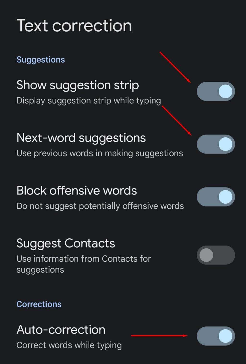 - For Gboard, tap Text correction and turn off all suggestions and auto-correction.