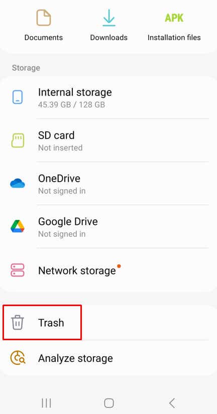 Android’s native File management app also has its own trash bins. Just tap the File Manager, or My Files app and scroll down until you find the trash bin folder. You can restore deleted Android data from here, or empty the trash folder.