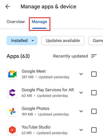 - Tap the Manage tab and it’ll display the list of all the apps installed on your device.