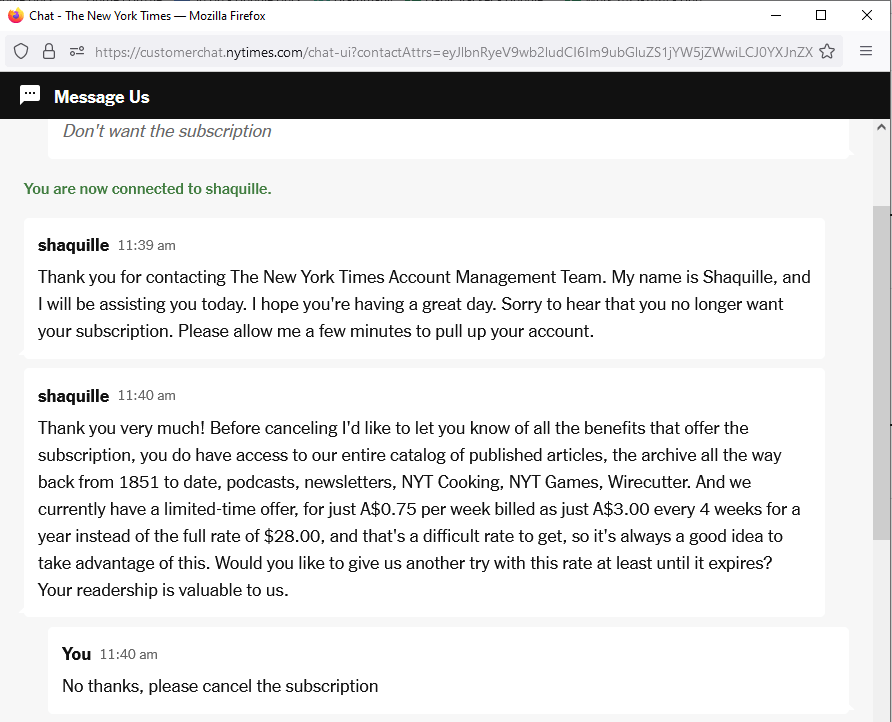 The second way subscribers can cancel their subscription is to use the NY Times website’s chat button. This is the easiest way to unsubscribe from most devices, including your PC, Android phone, or iPhone. Unfortunately, The New York Times app will send you through the same hoops.