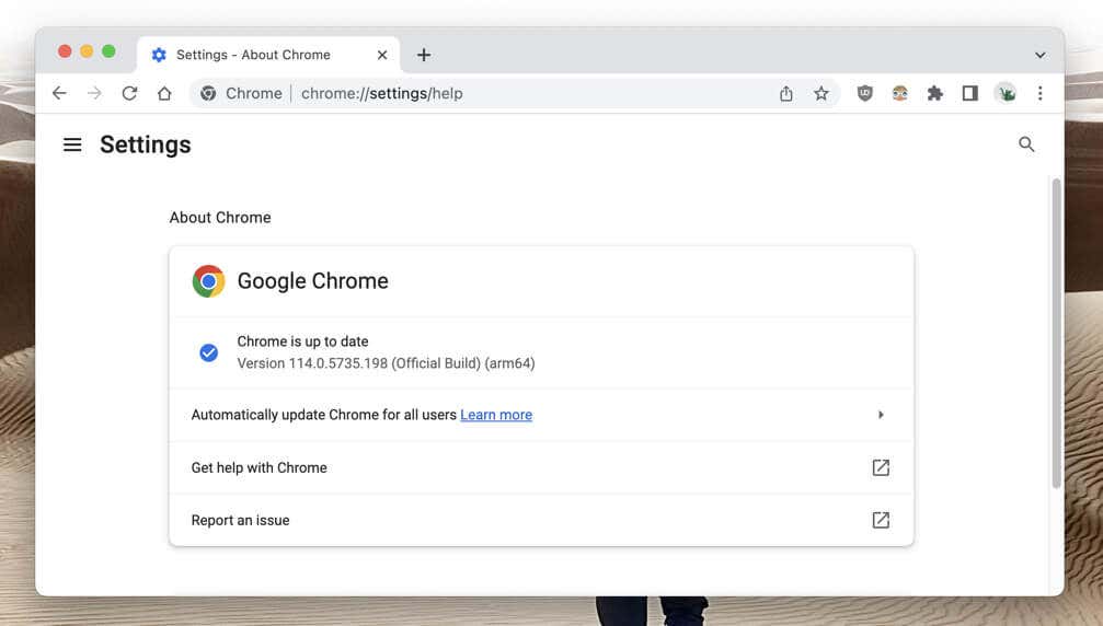 For example, if you use Google Chrome, open the Chrome menu, select Settings, and choose About Chrome on the sidebar. Then, wait until Chrome updates itself to its latest version.