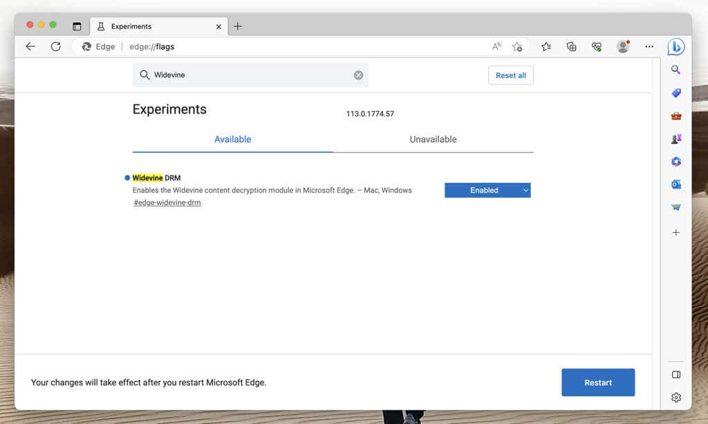 Microsoft Edge: Type edge://flags into the address bar and press Enter. On the Experiments screen that appears, type Widevine DRM into the Search box. Then, open the pull-down menu next to Widevine DRM and select Default or Enabled.