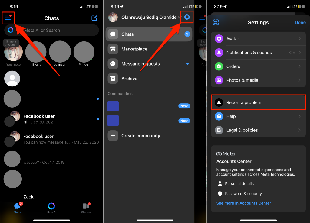 - Launch Messenger and tap the menu icon in the top-left corner. Next, tap the gear/settings icon in the top-right corner, and select Report a problem.