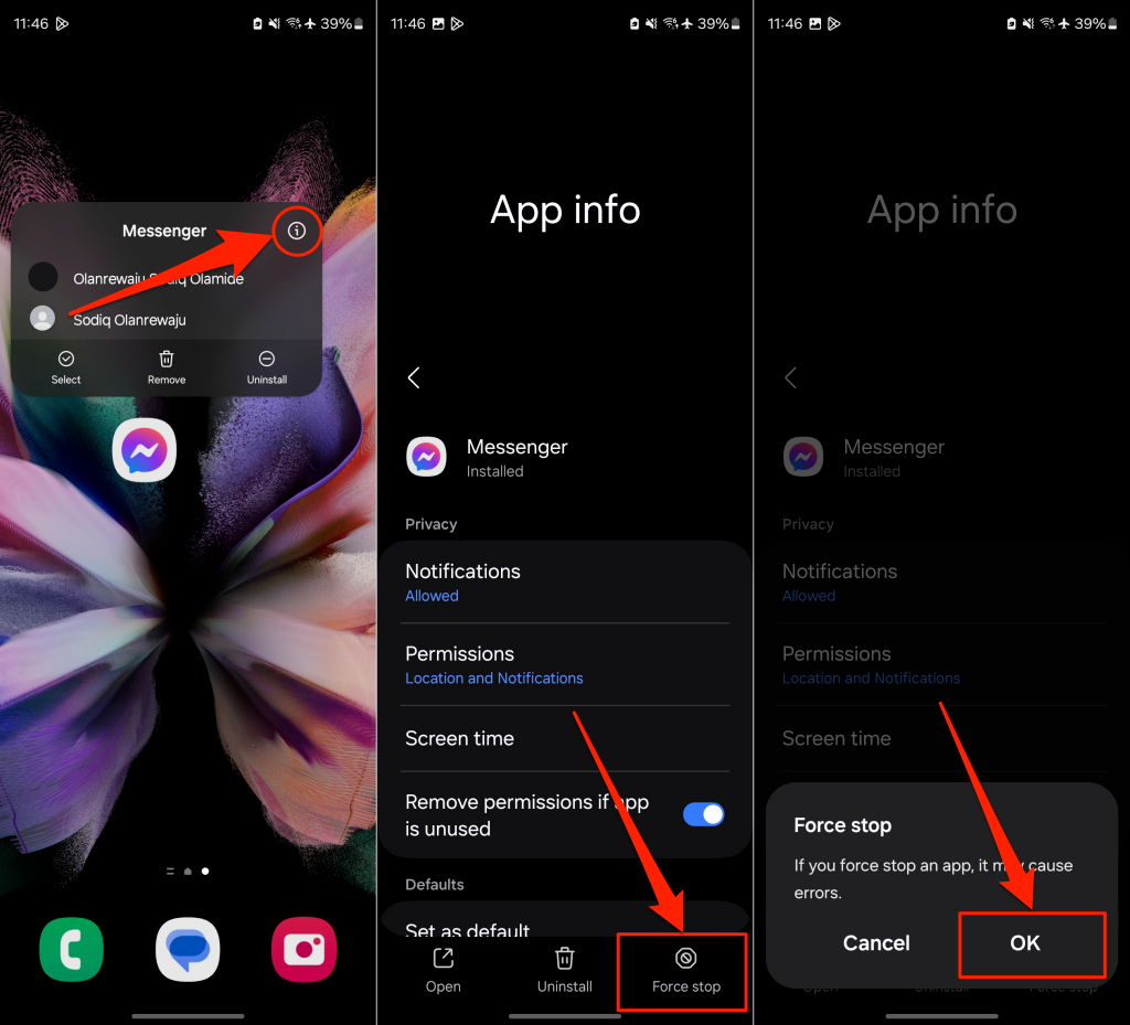 - Tap Force stop and select OK. Launch Messenger and check if your messages get delivered on your end.