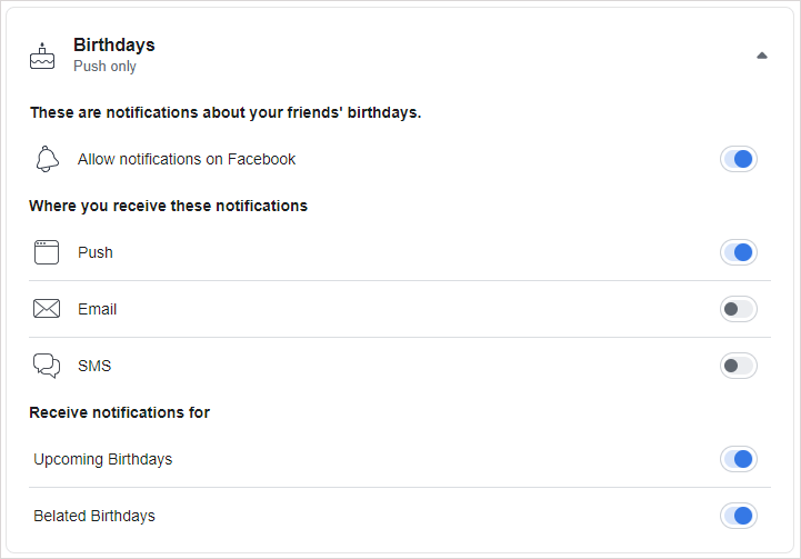 - Below that, turn on the toggle(s) for Upcoming Birthdays, Belated Birthdays, or both.