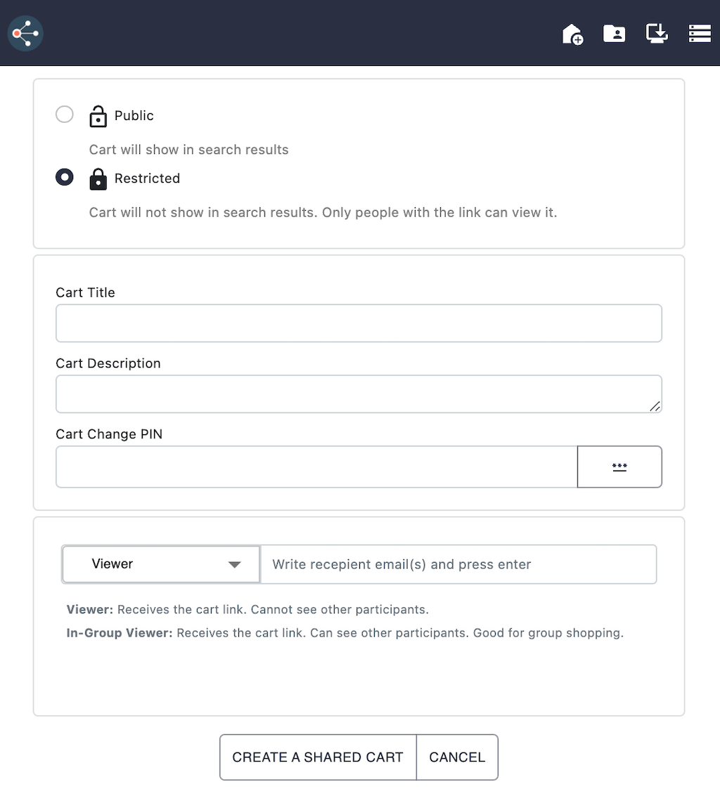 - To share your cart, select Share. Then the extension allows you to come up with the Cart Title, Cart Description, and Cart Change PIN. You can also set it to Public (the cart will show in search results) and Restricted (only people with the link can view it).