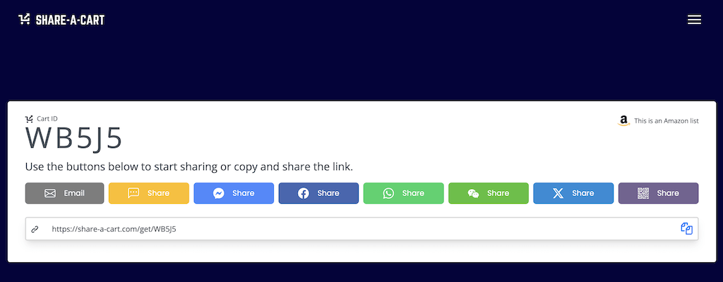 - You’ll see your Amazon Cart ID with the sharing options underneath the code. You can choose to Copy Code and share it manually with someone, or choose Share to open more options.