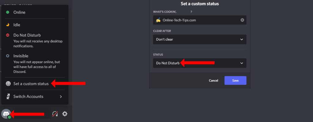 This is how you can use Discord’s set status feature to create a custom DND status for yourself. This functionality has the exact same effect as the standard Do Not Disturb status–all desktop notifications (including text messages and voice channels) will be muted on Discord.