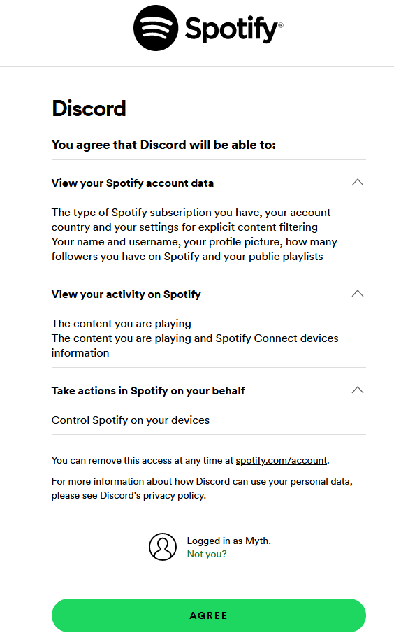 - Agree to authorize Discord to access your Spotify account.