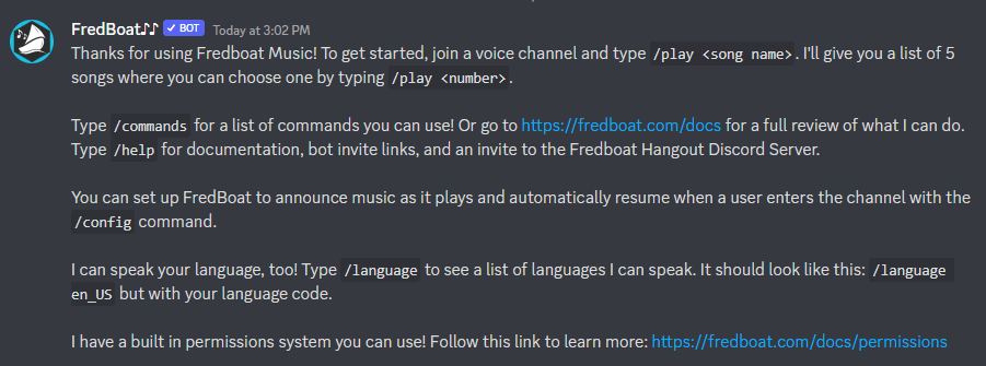 These are just several of the most common commands. To see more, you can check out the Fredboats commands page on the official website.