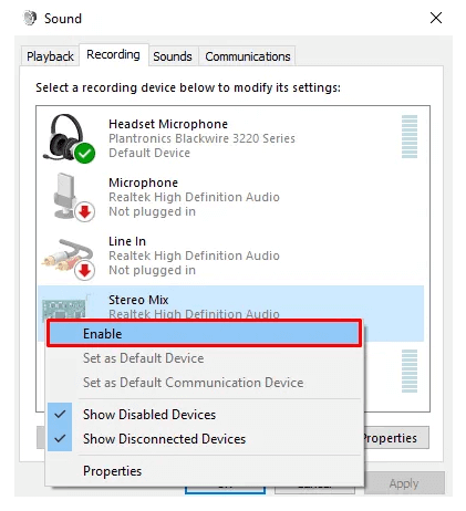 - Enable Stereo Mix and change it to the Default Mic.