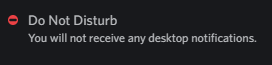 - Do Not Disturb (DnD for short): This status will let your friends and server members know that although you are online, you are not available for chat. The symbol of this status is a red circle in the corner of your avatar or profile icon. DnD status will also turn off all Discord-related notifications, so you won’t know if someone messages you. The Do Not Disturb status has to be set manually.