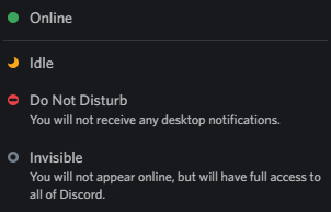 As you already noticed, Discord has a variety of statuses available to you. Here is a quick guide to what each of them means: