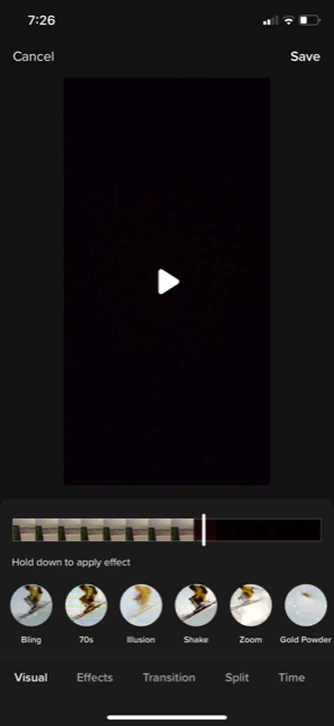 - Tap on which kind of effect you want: Visual, Effects, Transition, Split, or Time.