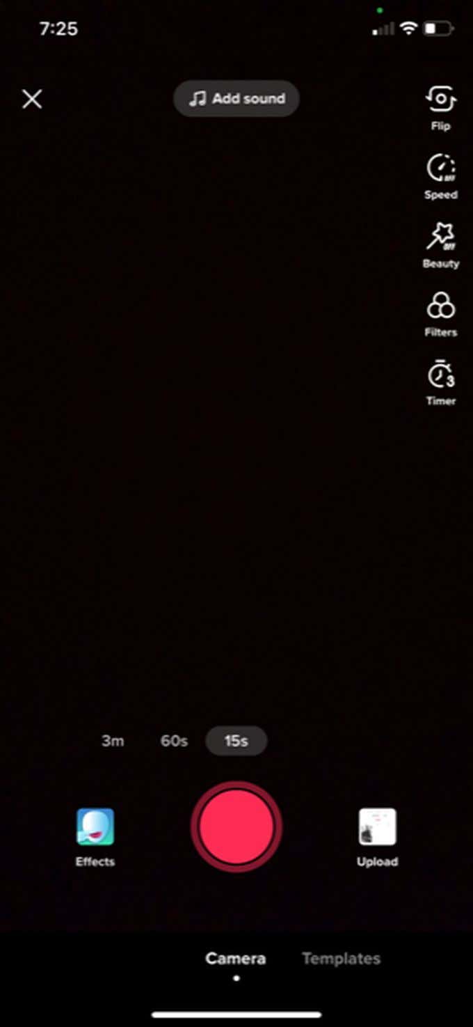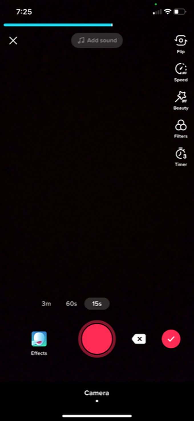 - If you want to add music/sound, make sure you tap on the Add Sound button at the top and search for or choose your audio before you start recording.