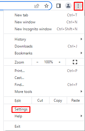 - Open Chrome and go to the three dots menu in the upper right corner. Select Settings from the drop-down menu.