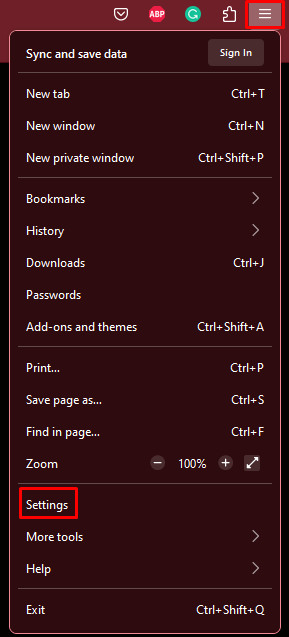 - Open Firefox and go to the hamburger menu in the top right corner. Select Settings from the drop-down menu.