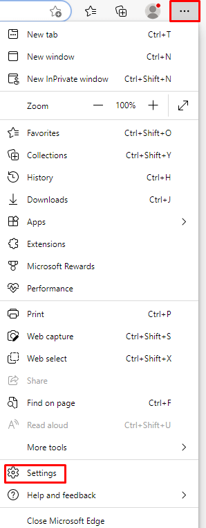 - Open the Microsoft Edge browser. Go to the three-dot menu in the upper-right corner and select Settings from the drop-down menu.