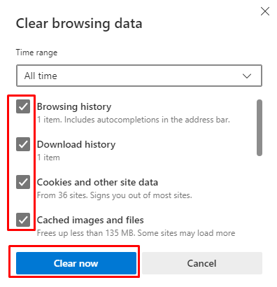 - Select Browsing history, Download history, Cookies and other site data, and Cached images and files to clear. Then click on the Clear now button to execute.