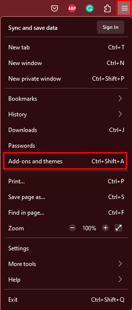 - Open the browser and go to a hamburger menu. Select Addon and Themes from the drop-down menu.