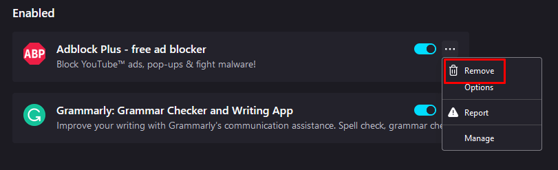 - To disable them, toggle the extension off. To remove them click the three dots next to the toggle switch, and select Remove.