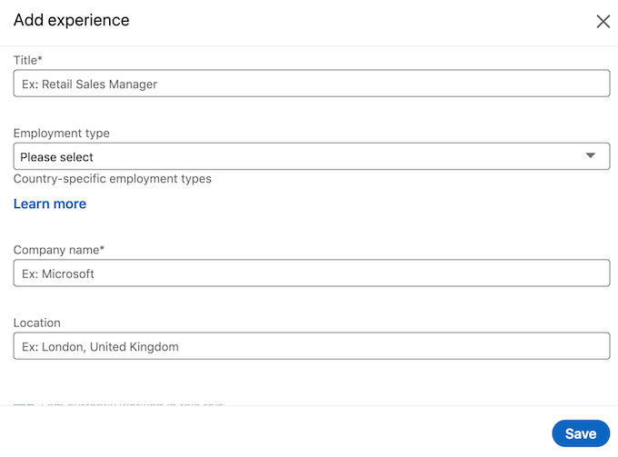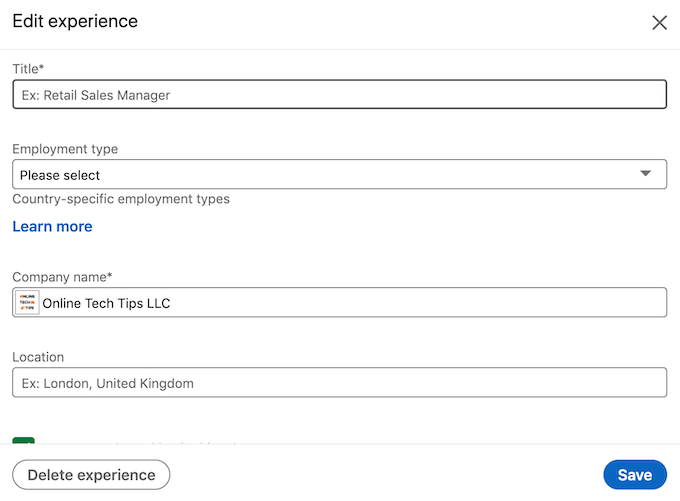 - Fill in the details of your new role in the Add experience window, including your Title, Employment type, Company name, Location, Start date, and any other details. Here you can also select to End current position as of now or not.