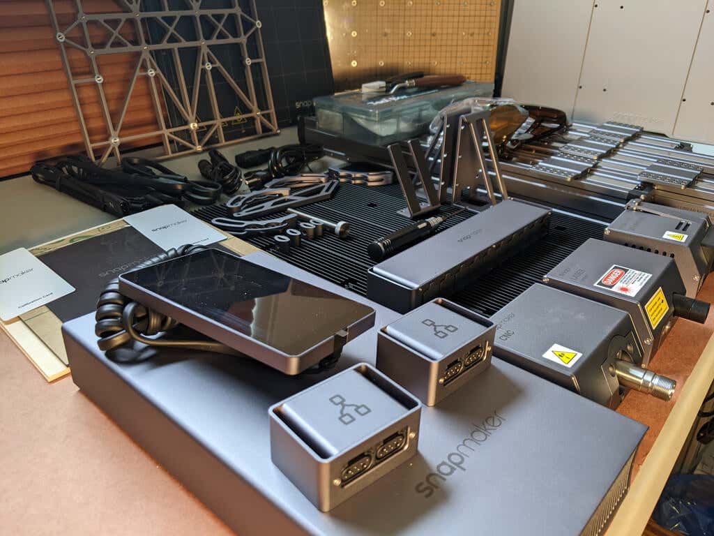 The Snapmaker 2.0 comes in a very large, heavy box because the parts list is lengthy, including: