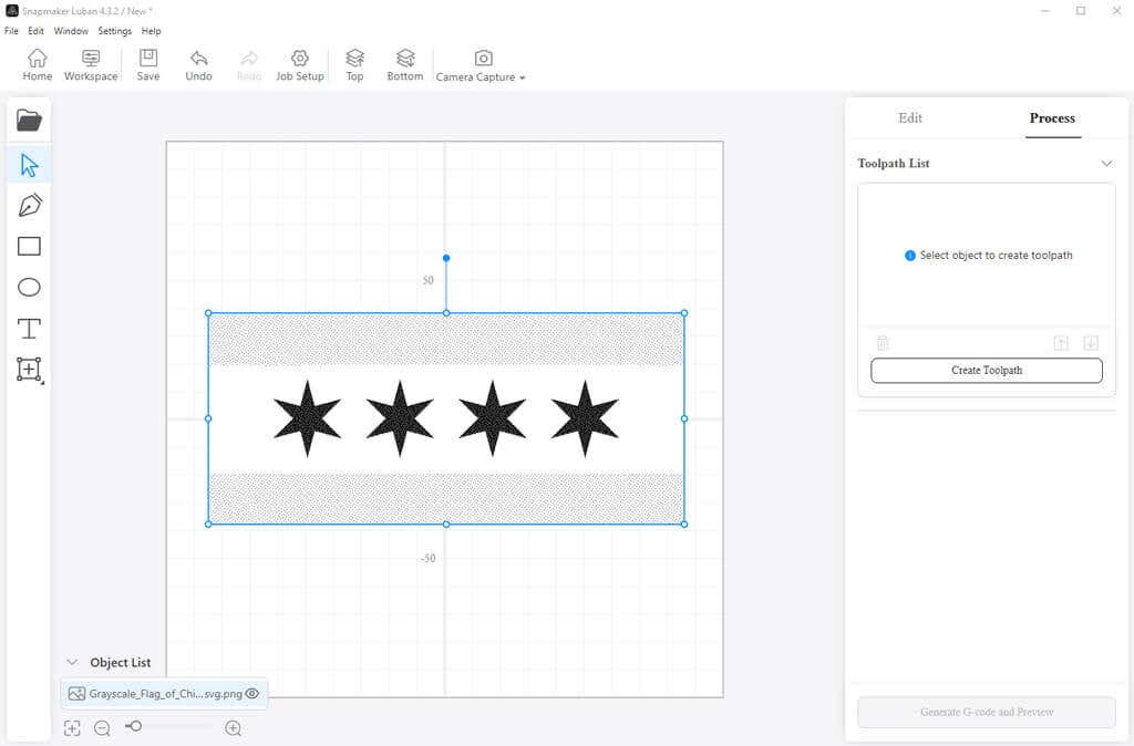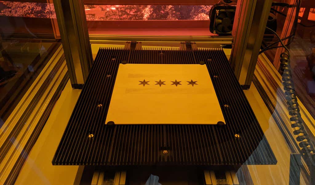 You can see from the photo below that we didn’t set the workspace home coordinates entirely correctly, so the design isn’t perfectly centered. In retrospect, we should have turned the power up or used a darker image. Having said that, our Chicago flag etching still looked good.